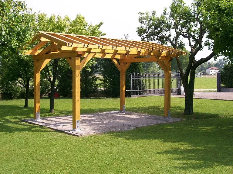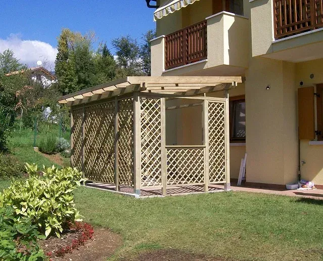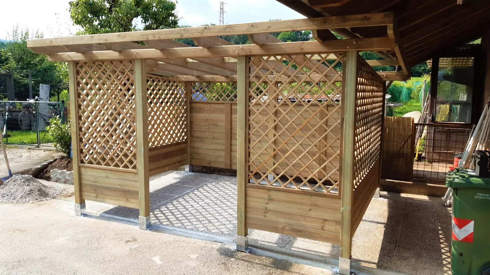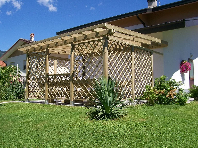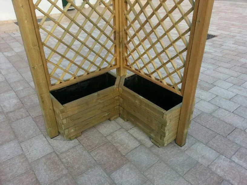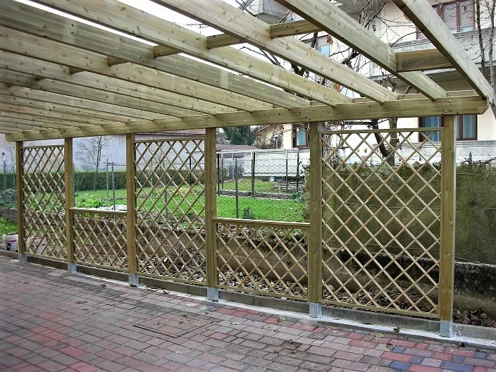 Il fissaggio a terra avviene tramite staffe zincate, da ancorare a platea o plinti in cemento armato. Nei modelli in pino è possibile inserire eleganti fioriere angolari, che oltre a fungere da ancoraggio offrono spazio per piante rampicanti e fiori.