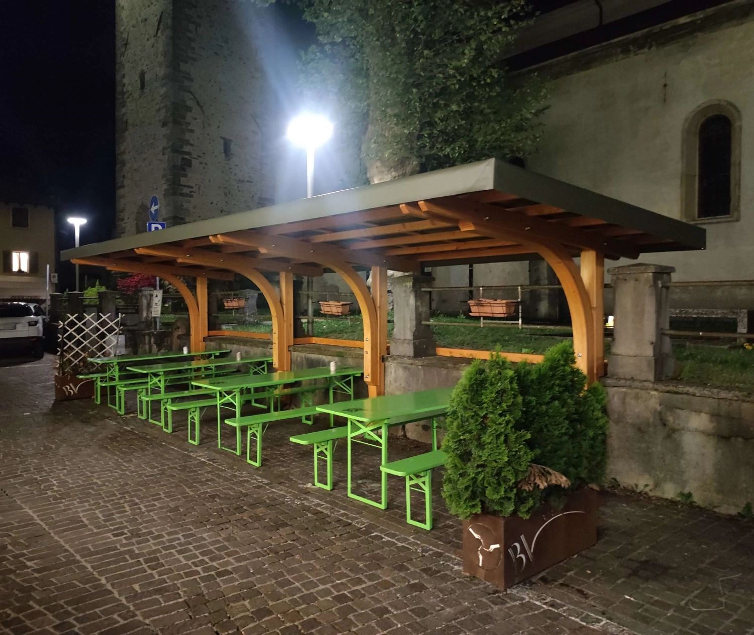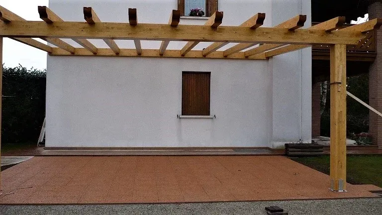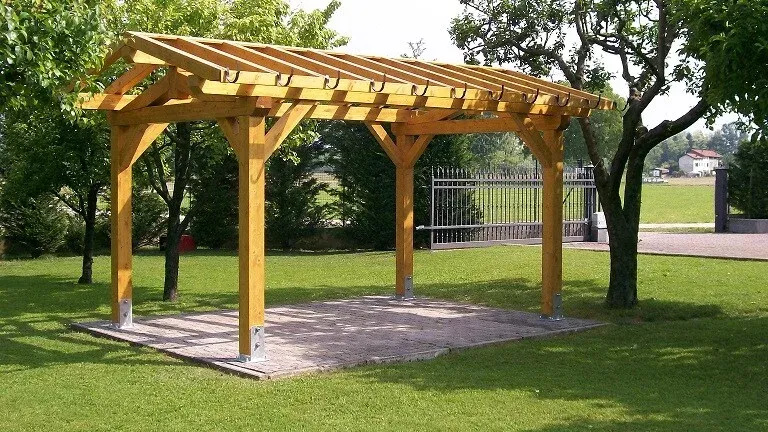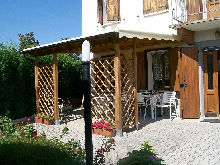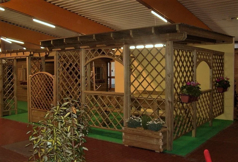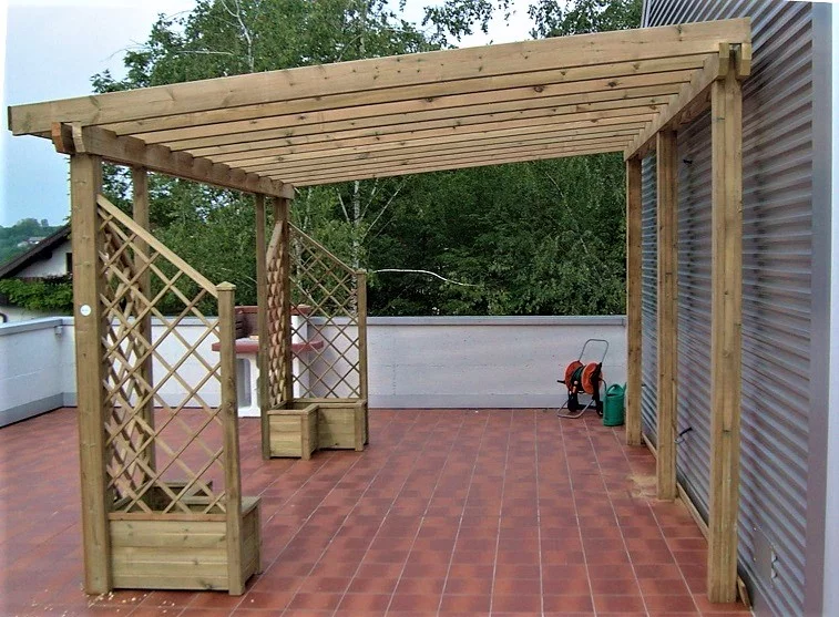 Il fissaggio a terra avviene tramite staffe zincate, da ancorare a platea o plinti in cemento armato. Nei modelli in pino è possibile inserire eleganti fioriere angolari, che oltre a fungere da ancoraggio offrono spazio per piante rampicanti e fiori.