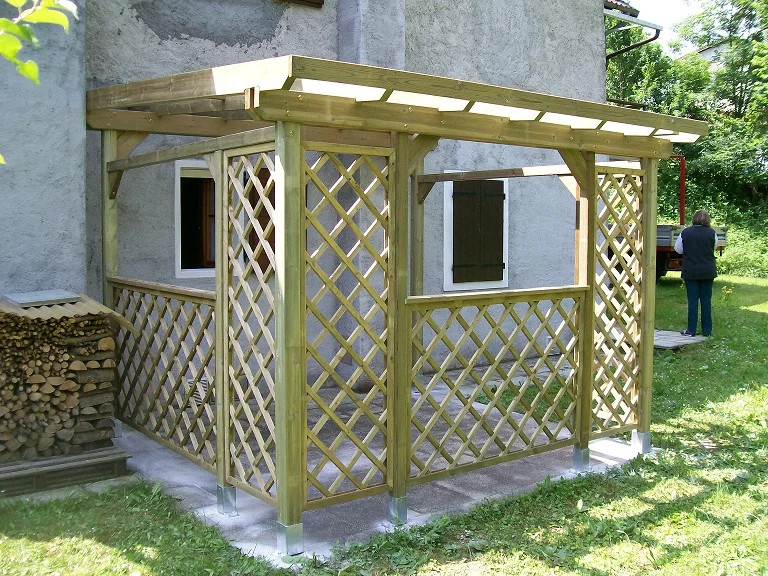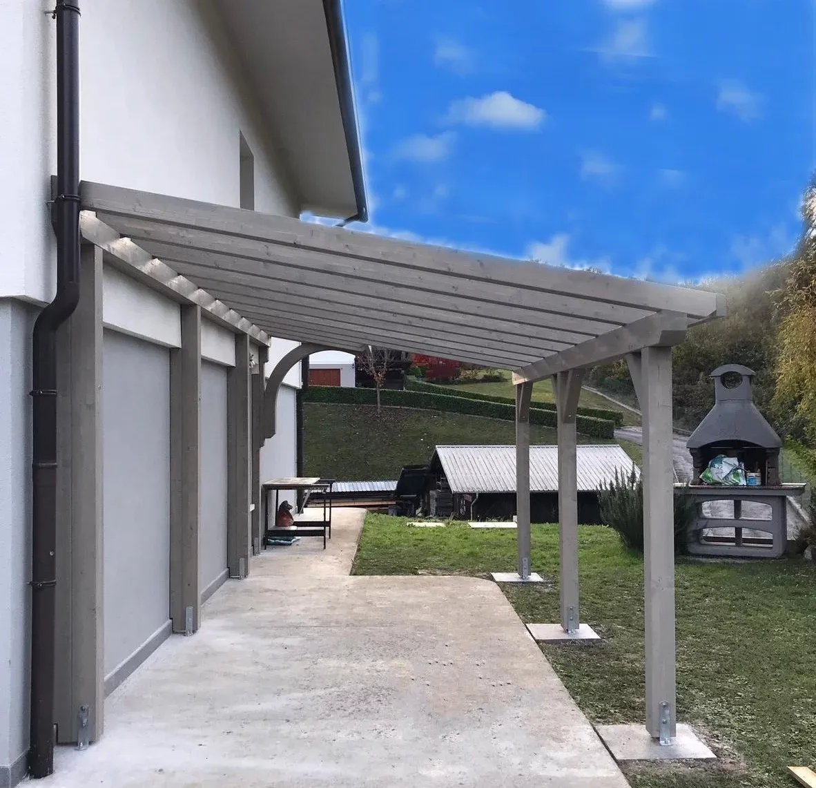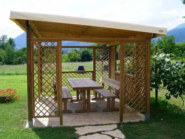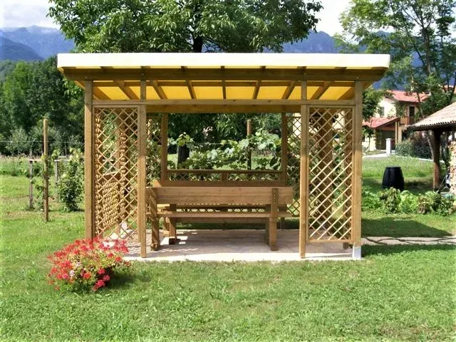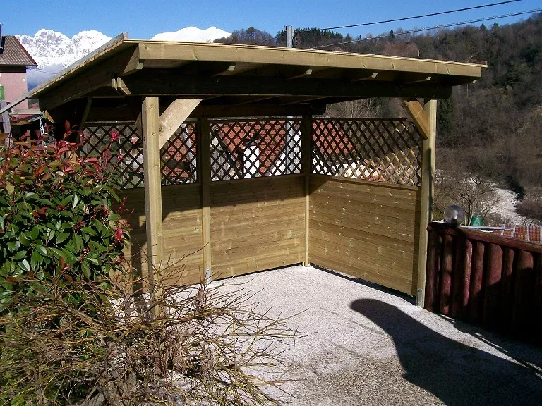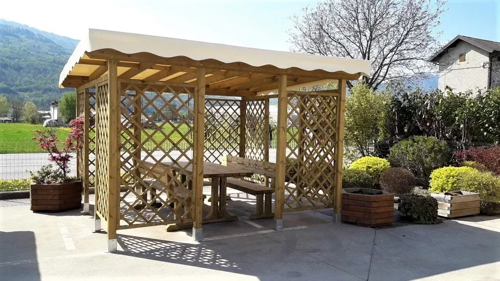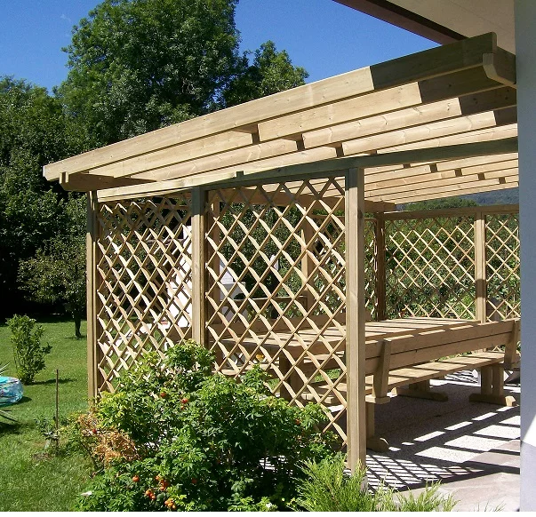 La struttura portante può essere personalizzata con grigliati in legno, da combinare liberamente secondo il vostro stile. Il sistema di incastri del tetto, realizzato con tavole spesse e resistenti, garantisce solidità e una lunga durata nel tempo.