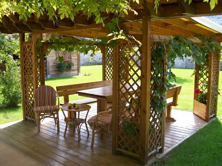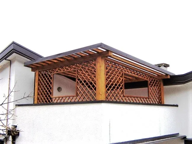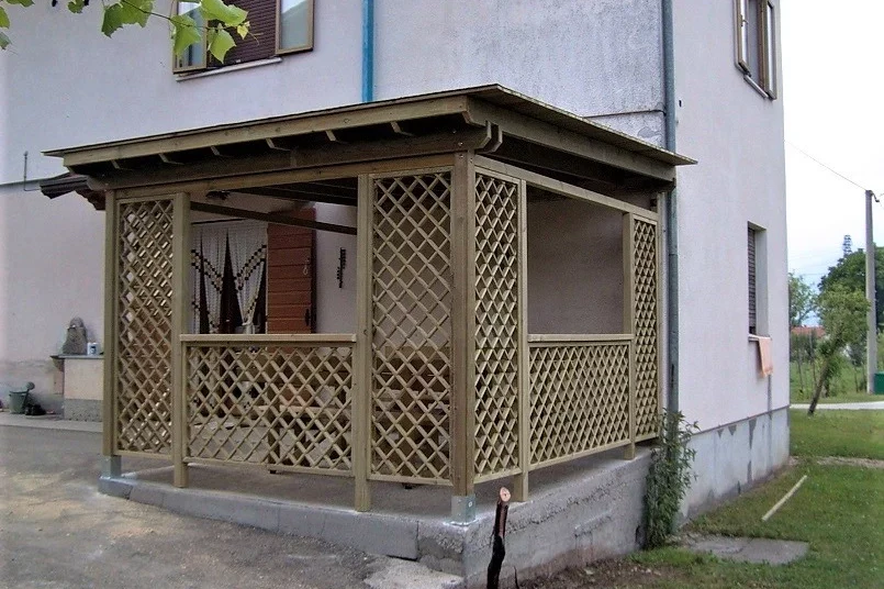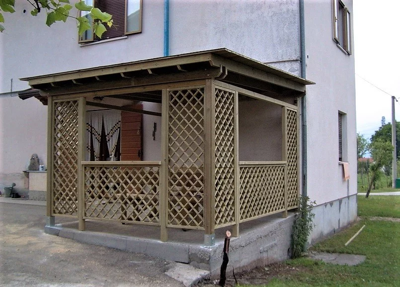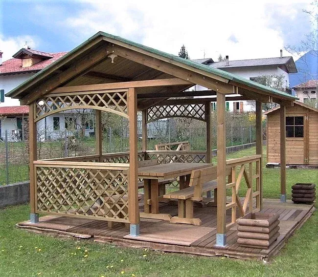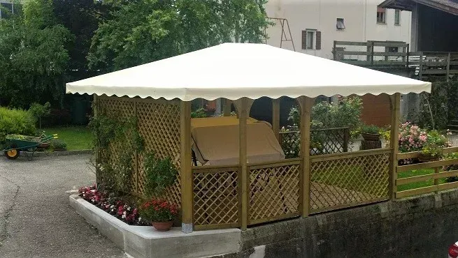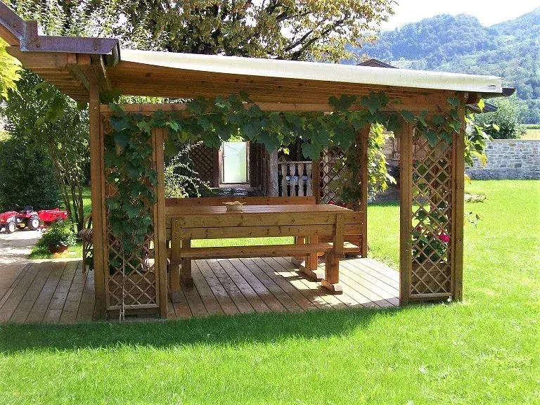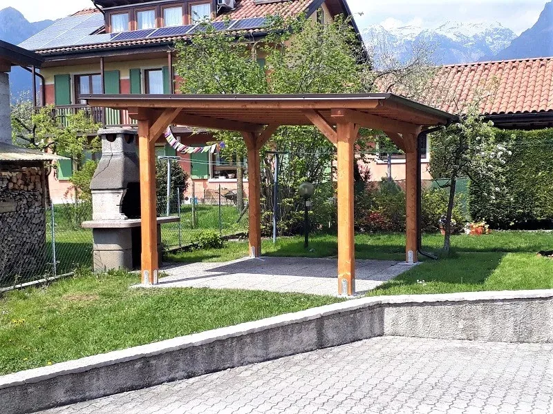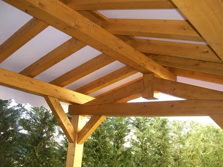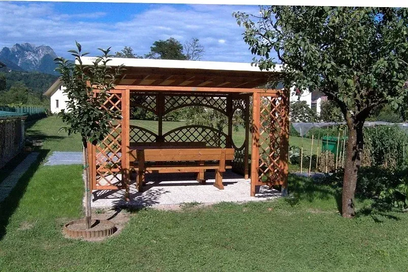 La struttura portante può essere personalizzata con grigliati in legno, da combinare liberamente secondo il vostro stile. Il sistema di incastri del tetto, realizzato con tavole spesse e resistenti, garantisce solidità e una lunga durata nel tempo.